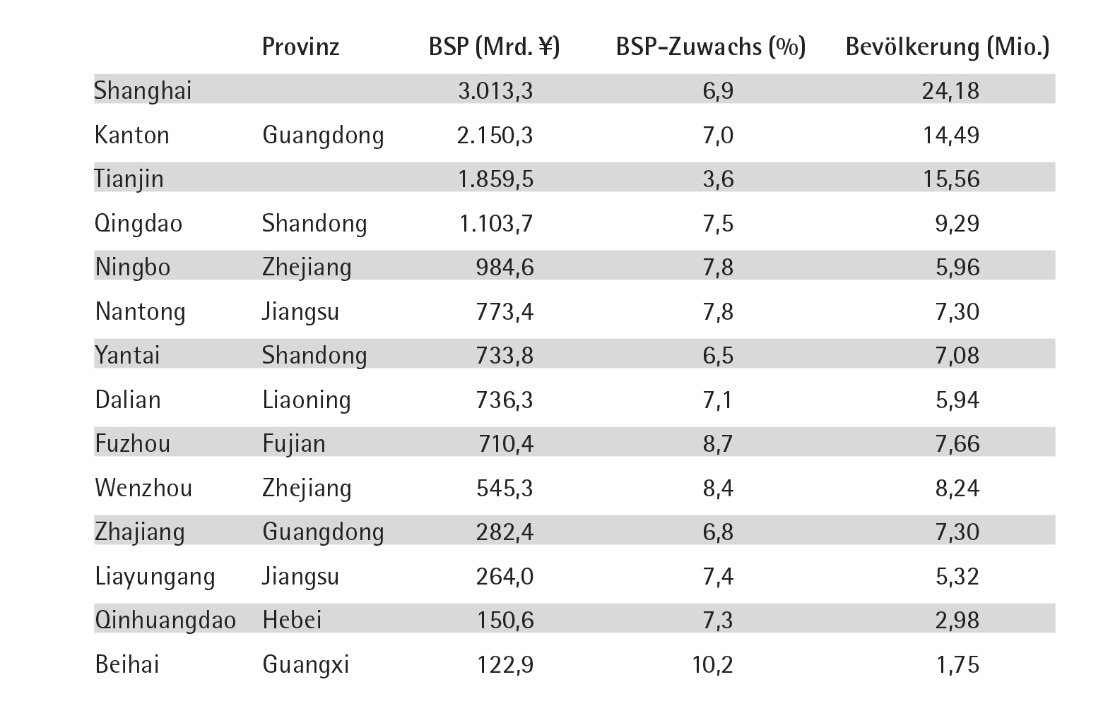 Ein halbes Jahrzehnt nach Beginn der Reform- und ?ffnungspoltik im Jahr 1978 hat die chinesische Regierung 14 K¨¹stenst?dte ge?ffnet, um sie f¨¹r Investoren attraktiver zu machen und Ma?nahmen der Refrom- und ?ffnungspoltik gezielt umzusetzen. Unter den offenen K¨¹stenst?dten waren auch die beiden Shandonger H?fen Qingdao und Yantai. Mit einem Wirtschaftswachstum von 7,5 Prozent im vergangenen Jahr hat Qingdao nach Shanghai, Kanton und Tianjin heute die viertst?rkste Wirtschaftskraft. In den 40 Jahren der Reform- ?ffnungspolitik ist die Wirtschaftsleistung Qingdaos um das 286-fache gestiegen. Yantai rangiert 2017 unter den 14 St?dten auf dem 7. Rang.