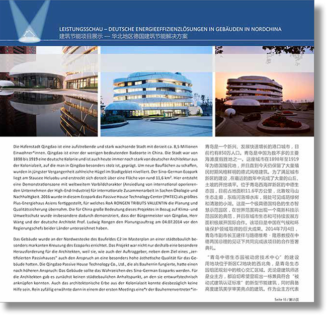 Parallel hat das Department Building, Energy & Environment der AHK Peking eine informative 32 Seiten umfassende Broschüre herausgeben, in der die 5 ausgezeichneten Gebäude ausführlich in Deutsch und Chinesisch vorgestellt werden, darunter das Passivhaus im Deutsch-Chinesischen Ökopark.