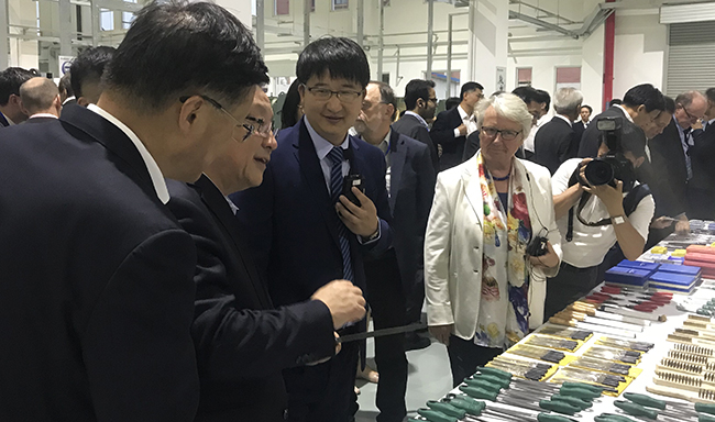 Die Vorsitzenden des Deutsch-Chinesischen Dialogforums, der stellvertretende Vorsitzende der Politischen Konsultativkonferenz Wan Gang und die fr¨¹here Bundesbildungministerin Annnette Schavan, informieren sich bei Rhein-K?ster ¨¹ber die duale Berufsausbildung im Deutsch-Chinesischen ?kopark.