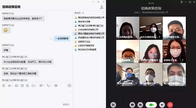Um bestehende Probleme und insbesondere solche im Zusammenhang mit den gegenwärtigen Quarantäne-Maßnahmen zu lösen, hat die Qingdao West Coast Investment Promotion Co., Ltd. am 10. Februar dieses Jahres acht Großinvestoren zu einer Video-Konferenz eingeladen. Gemeinsam mit den Unternehmen wurde beraten, wie die Quarantäne-Maßnahmen umgesetzt werden können, ohne die Produktion zu beeinträchtigen, wie Personal gewonnen werden kann und welche finanzielle Unterstützung notwendig ist, um Verluste durch die angespannte Situation aufzufangen.