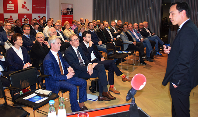 Das traditionelle "Fischessen der Wirtschaftsjunioren Paderborn-Höxter" am Aschermittwoch stand in diesem Jahr unter dem Motto "Go versus Schach – Markteinstiegschancen in China". Als Ehrengast stellte Frank Lenhardt von der Frankfurter Repräsentanz des Deutsch-Chinesischen Ökoparks die aktuelle wirtschaftliche Entwicklung im Ökopark vor und erläuterte Möglichkeiten für den Markteinstieg in China sowie die Chancen, die ein Engagement in Qingdao bietet. Außerdem berichtete er über die erfolgreiche Partnerschaft zwischen dem Deutsch-Chinesischen Ökopark und der Universität Paderborn. Im vergangenen Herbst hatte die Universität Paderborn gemeinsam mit der Universität für Wissenschaft und Technik Qingdao im Ökopark den Deutsch-Chineisischen Campus eingeweiht.