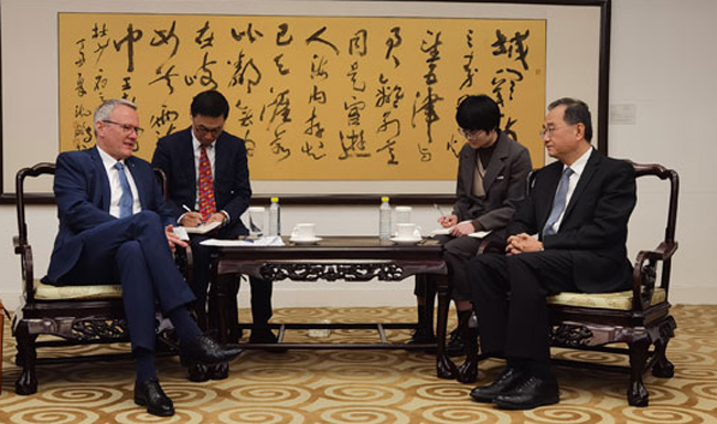 Die bilateralen Wirtschafts- und Handelsbeziehungen sind ein wichtiger Stabilit?tsfaktor in den deutsch-chinesischen Beziehungen, erkl?rte der stellvertretende chinesische Au?enminister Deng Li bei einem Treffen mit dem Vorsitzenden der Deutschen Auslandshandelskammer (AHK) Nordchina, Stephan W?llenstein, CEO der Volkswagen Group China.